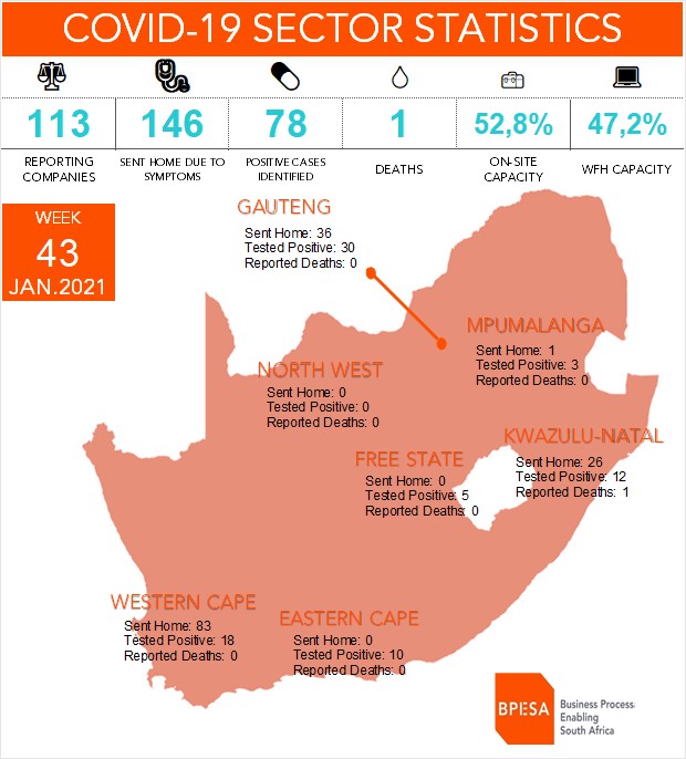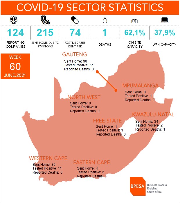 - In the past week 100 companies reported to BPESA. 48% of them were from the GBS Sector, 10% from the ICT Sector and 40% from the Financial Services Sector. 63% of reporting companies were non-members of BPESA. However, there are still companies not reporting which is concerning as this leaves gaps in visibility of the actual status of COVID-19 and limits BPESA’s ability to support and intervene where there is non-compliance.